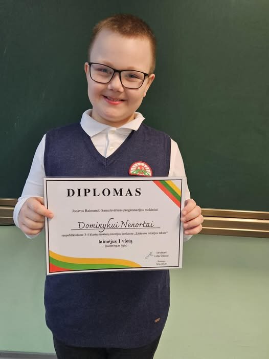 Nuoširdžiai sveikiname Dominyką su šiuo reikšmingu laimėjimu, linkime ir toliau domėtis Lietuvos istorija, siekti aukščiausių rezultatų bei drąsiai žengti žinių keliu!