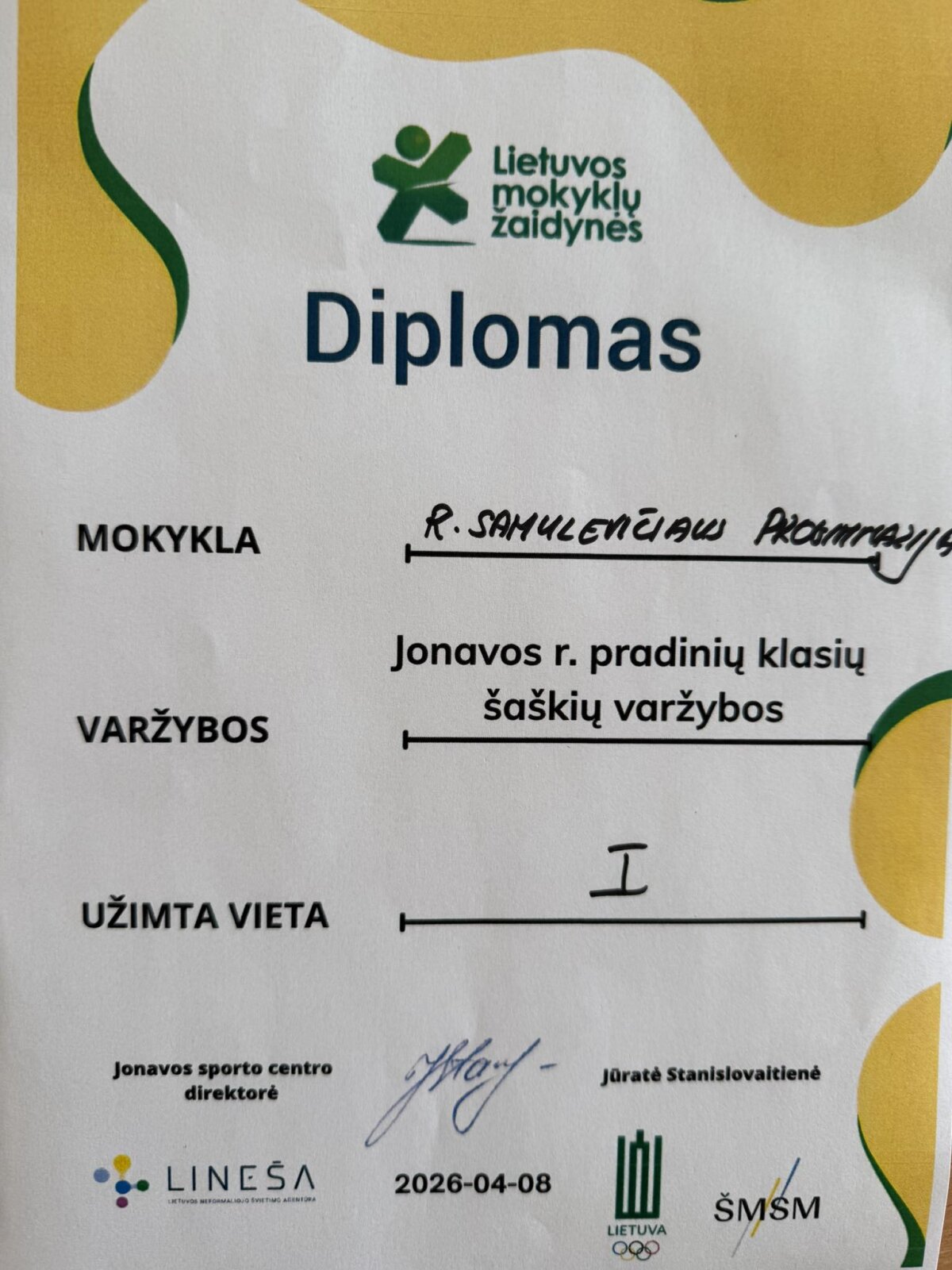 Balandžio 8 dieną Jonavos sporto arenoje virė įtemptos kovos – čia vyko Jonavos rajono 1-4 klasių mokinių šaškių varžybos. Puikiomis žiniomis dalijasi mūsų progimnazijos komanda, kuri tarp gausaus būrio dalyvių įrodė savo pranašumą. Mūsų progimnazijai atstovavo keturi žaidėjai: Eimantė Budrevičiūtė (3b kl.), Dominykas Budrys (2b kl.), Jogaila Kružikas (2b kl.) ir Alhaj Mohammad (3c kl.). Po penkių intensyvių žaidimo turų, susumavus visus taškus, paaiškėjo džiuginantis rezultatas – mūsų komanda iškovojo garbingą I-ąją vietą! Pergalė rajone atvėrė kelius į dar didesnį iššūkį – jau kitą savaitę jaunieji šaškininkai vyks į Vilnių, kur susirungs Lietuvos neformaliojo švietimo agentūros (LINEŠA) organizuojamose finalinėse varžybose. Linkime sėkmės ir aštraus proto finale!
