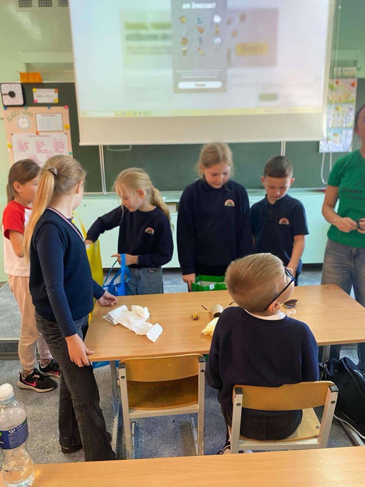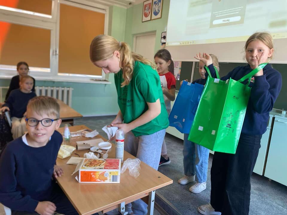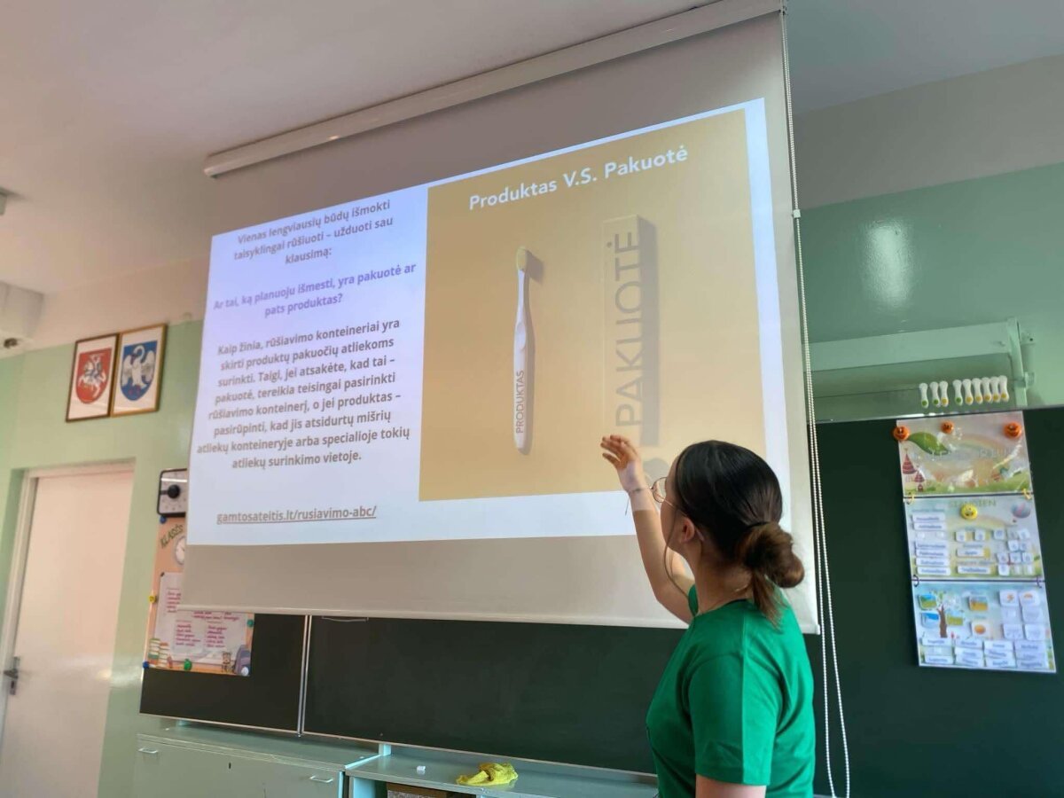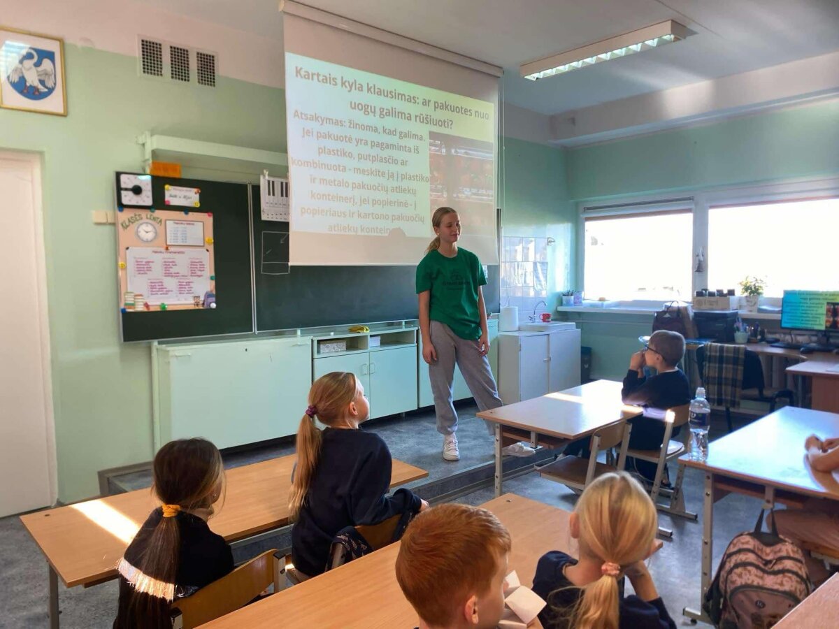 Spalio 24 d. ketvirtadieni “Žaliosios komandos” dvi narės Agnė Baltrušaitytė 7b ir Viltė Rachinbachė 7c pravedė 3a klasės mokiniams pamoką “Rūšiavimo ABC”. Šios pamokos metu “Žaliosios komandos” atstovės pristatė pagrindines daromas klaidas rūšiuojant, supažindino mokinius su pagrindinėmis rūšiavimo taisyklėmis.