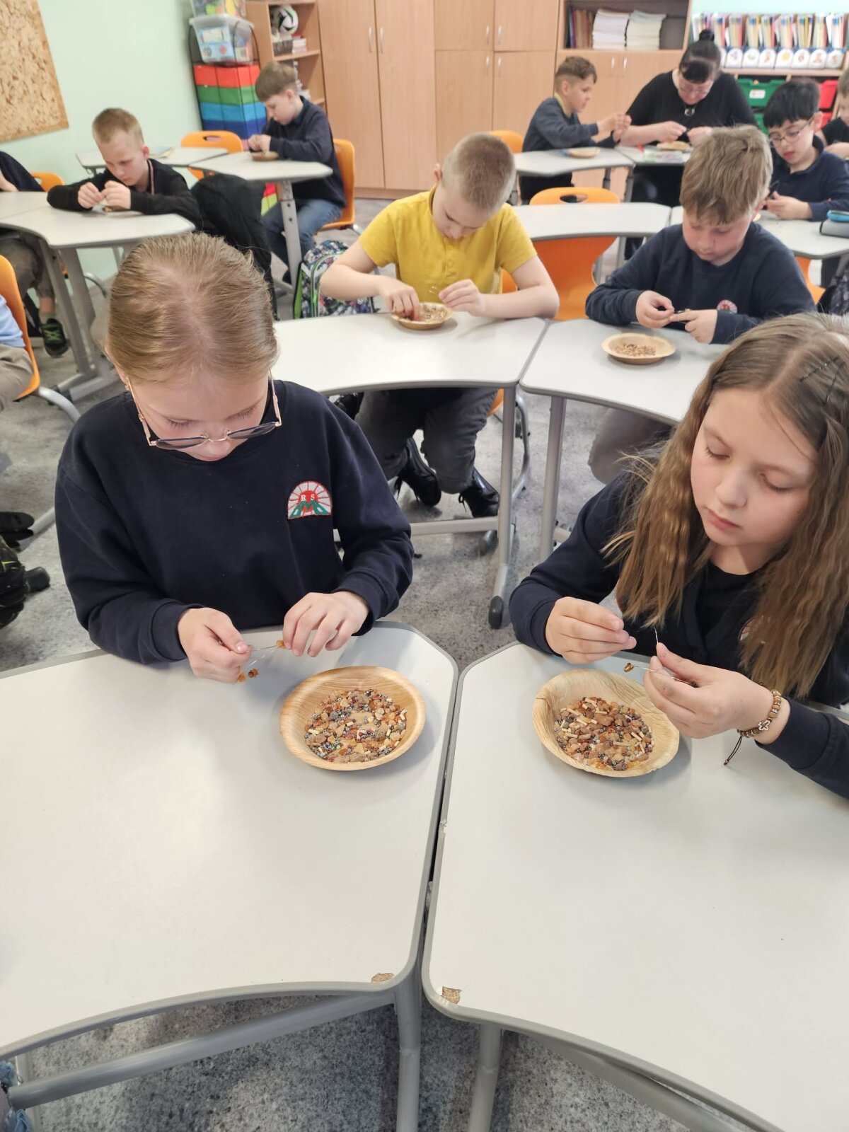 Kūrybinėje dalyje kiekvienas tapo juvelyru – atsirinkę tikro gintaro karoliukus, derino juos su kitomis medžiagomis ir kūrė unikalias apyrankes mamoms Motinos dienos proga.
