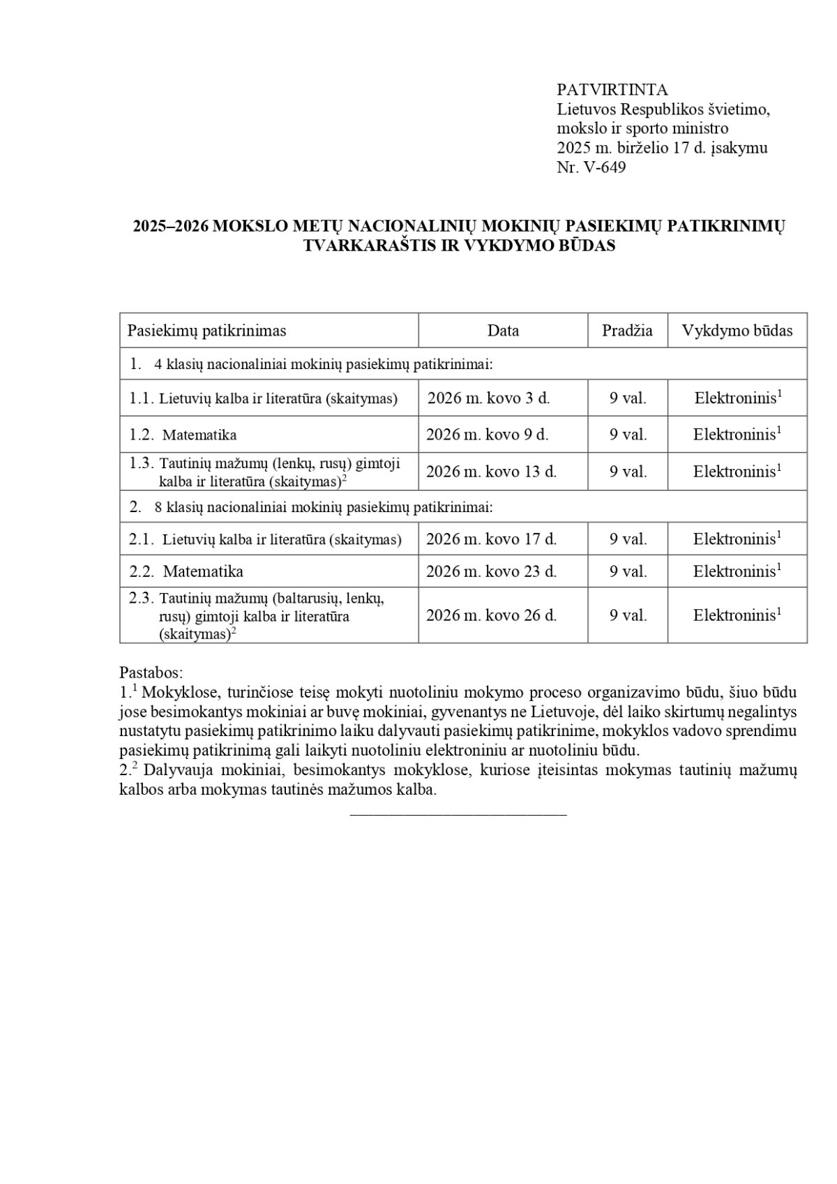 2025 - 2026 m. m. NMPP tvarkaraštis ir vykdymo būdai